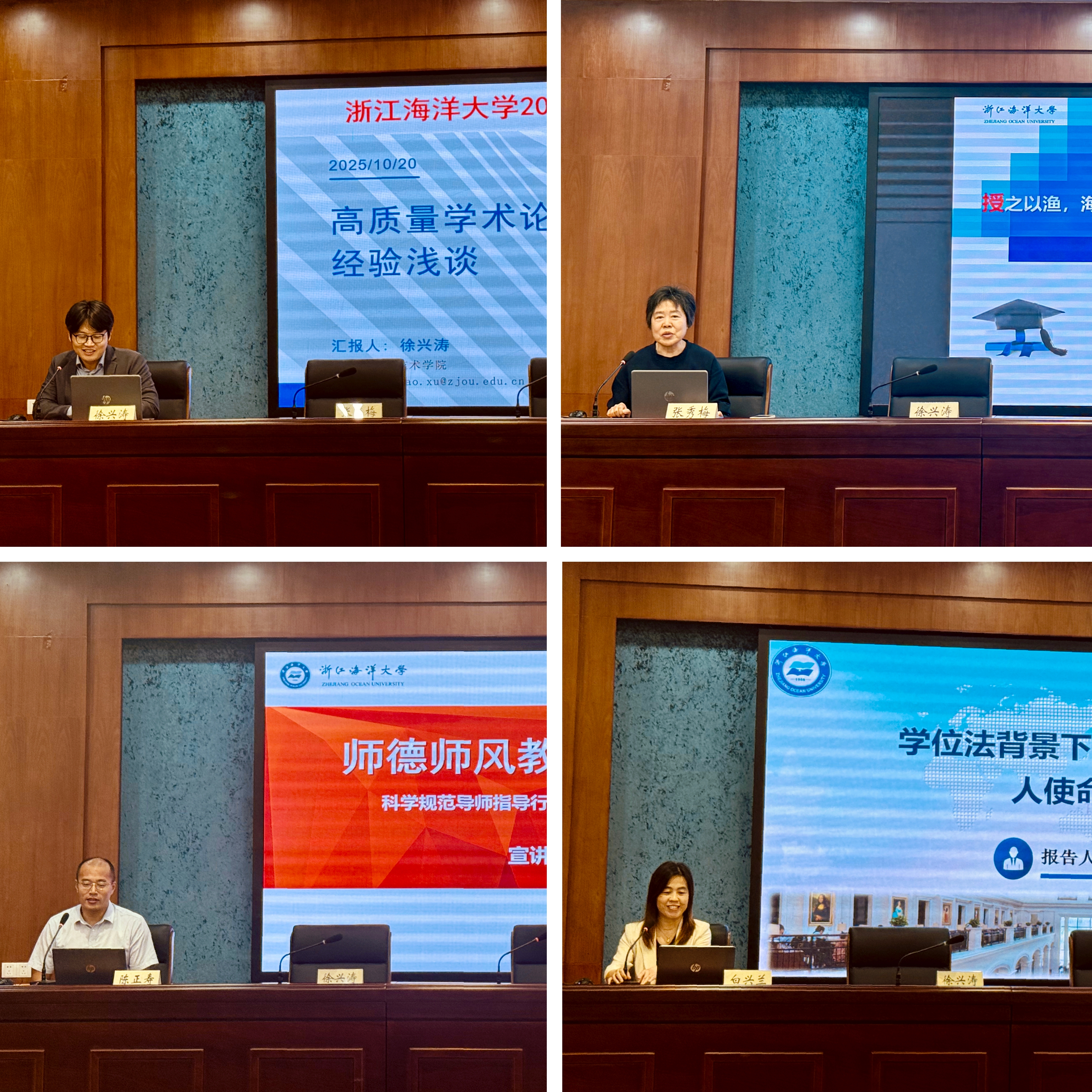 海洋科学与技术学院徐兴涛教授以《高质量学术论文发表经验浅谈》为题,结合个人论文发表经历,系统分享了在研究生培养过程中如何有效训练科研思维与学术表达能力,助力学术发表高水平论文;水产学院张秀梅教授以《授之以渔,海阔天空:博士生培养中的放手与支撑》为题,通过生动案例分享了其在研究生培养中如何营造张驰有度的科研氛围,尊重学生个体差异,动态调整指导策略,真正做到因材施教;海洋工程装备学院陈正寿教授以《师德师风教育与科研伦理》为题,结合制度规范讲解与典型案例警示,引导导师树立优良师德师风,严守科研伦理底线,营造风清气正的育人环境和科研氛围;研究生院院长白兴兰教授以《学位法背景下研究生导师的育人使命与担当》为题,以《教育部关于加强博士生导师岗位管理的若干意见》《学位法》等文件精神为指导,阐述新形势下研究生导师的育人使命与岗位职责,为研究生导师在立德树人、学术指导、创新能力培养等方面提供思路和借鉴。